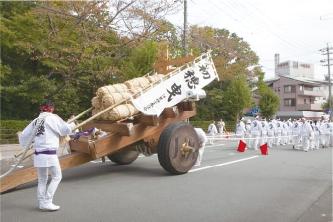 神宮式年遷宮に伴う伊勢の民俗行事「お木曳行事」「お白石持行事」の伝統を継承し、次世代に伝えることを大きな目的として昭和47年からはじまり、神宮の神嘗祭をお祝いし、その年に収穫されたお初穂を神宮へ奉納します。