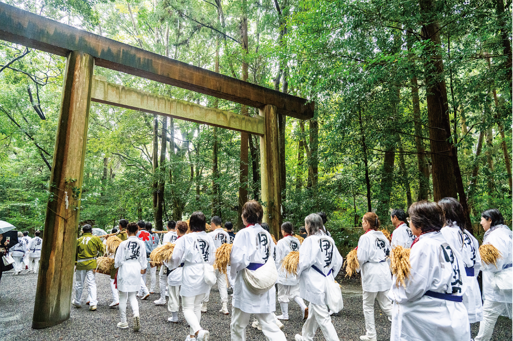 外宮領陸曳は、神宮の2台の奉曳車を使用し、お木曳・お白石持行事における荷締め等の技術を継承する意義もあり、それぞれに稲束、俵を積んで、たわわに稔ったお初穂を飾り奉曳します。 曳き手は伊勢の町衆、皇學館大学生、そして次世代を担う伊勢の子どもたち。 木遣り唄が秋空に響く中、「エンヤ!」のかけ声で奉曳車を外宮北御門へと曳き入れます。 そしてお初穂を手にして外宮へ奉納、収穫への感謝を込めて一同で参拝します。